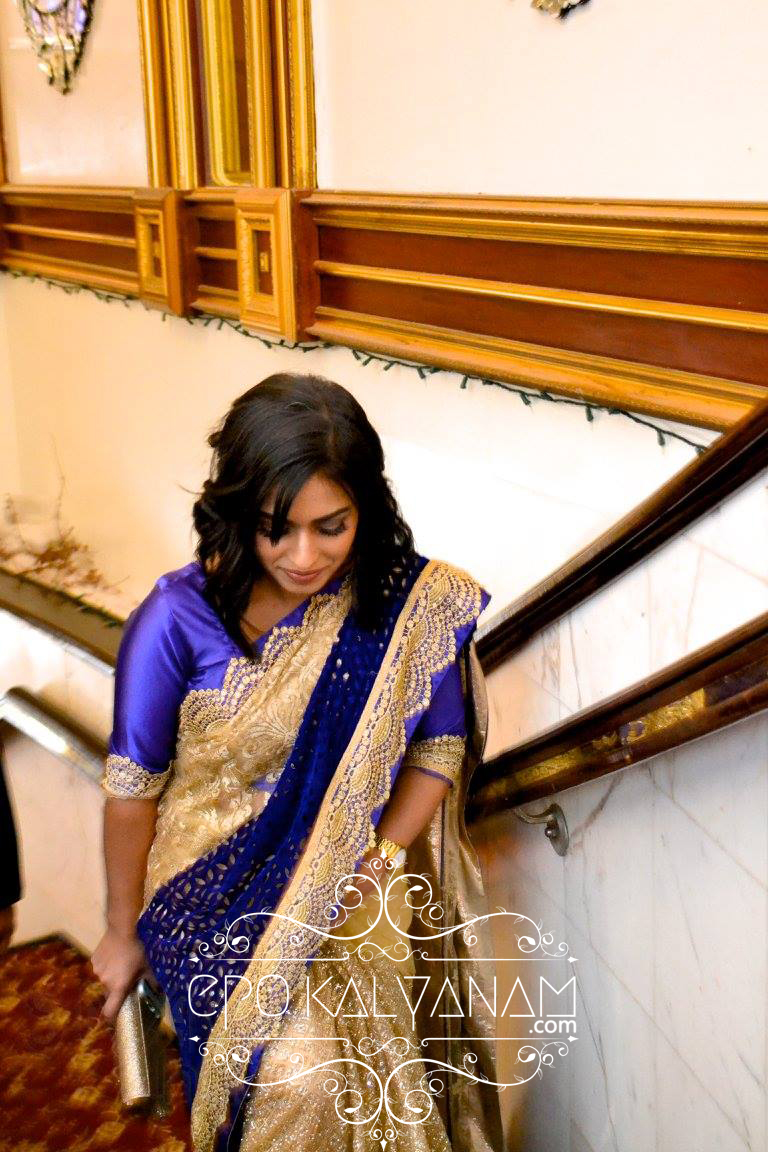 Meet our breathtaking bride and groom, Lina and Robin . For their engagement, Lina stepped out in a royal blue and gold sari from Sareez,U.S.A. If you look closely you’ll see that the saree has portions of deep blue velvet intertwined with golden lace and scalloped borders which is quite different and never seen before . I personally think scalloped borders will be ruling bridal wear trends for some time to come. So if you’re looking for unique alternatives to straight cut designed hems and borders or you just want it to look different and add some texture, scalloped edging is your best bet.