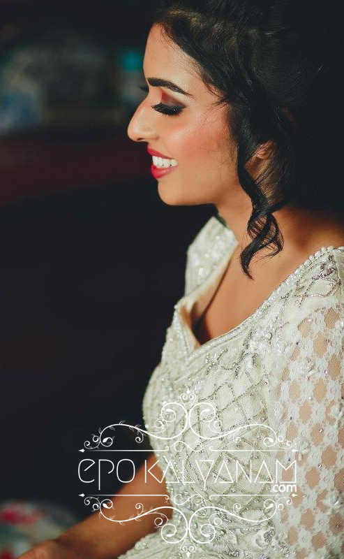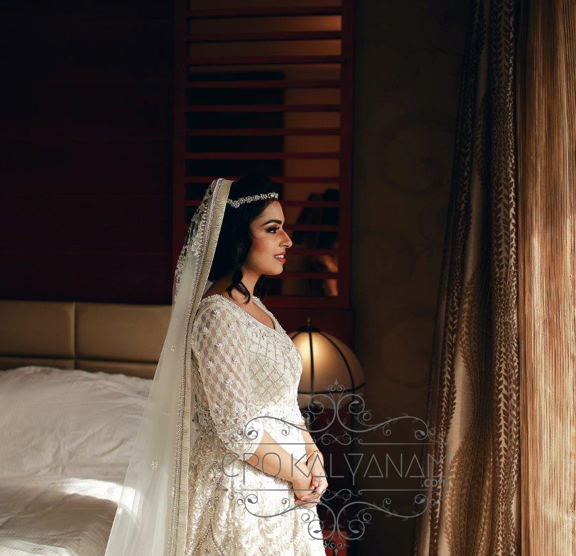 Now there’s nothing more that I love than a bride who chooses to look different and decides to put a little bit of herself into her wedding day ensemble. It is this wedding dress that made me reach out to this stunner. It’s something I’ve never seen before on a bride and I was so curious to know what inspired her to choose such a different little number. For her wedding, our belle went with an embroidered white and silver jacket lacha from Nazrana, USA. The blouse is embellished with crystal stones while the sleeves are of lace, hand stitched with floral embroidery and pearls.