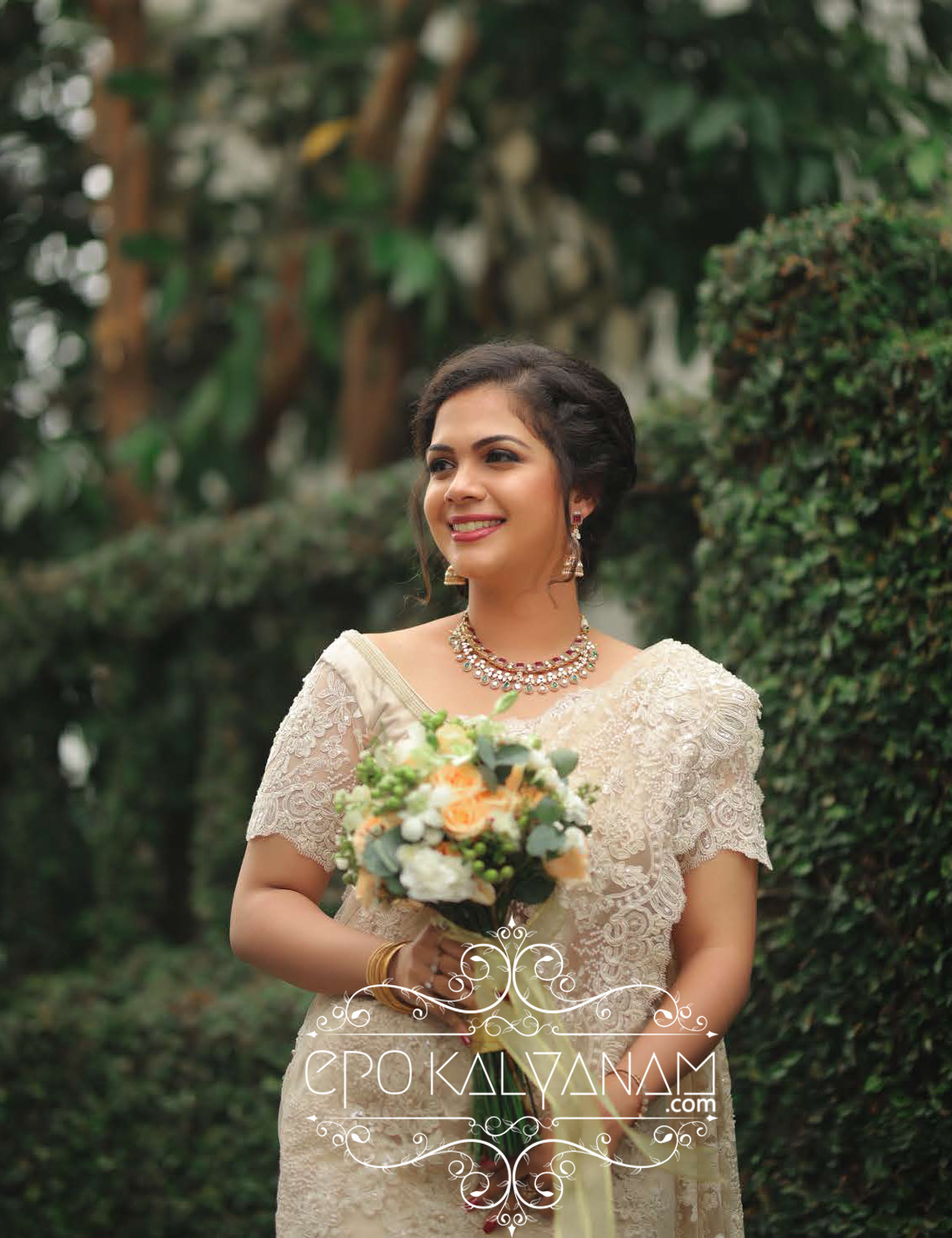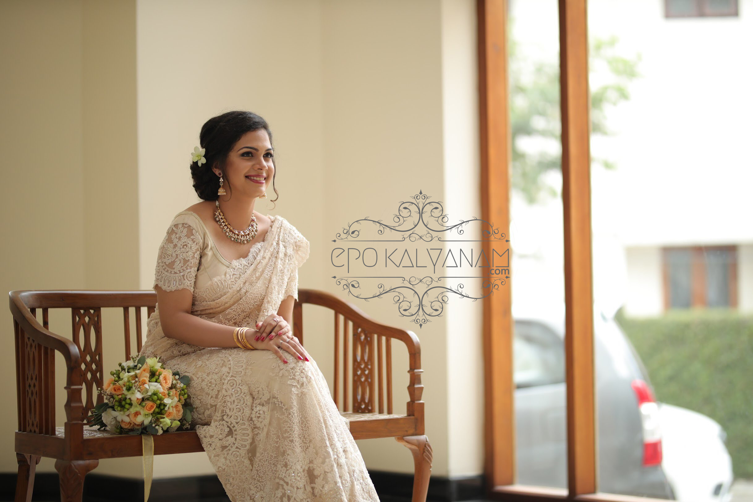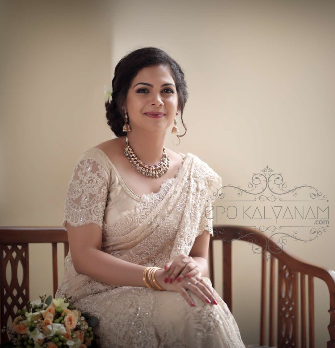 Now their wedding is my personal favorite and you’ll see why 😊.What makes the bride feel the most amazing on her big day is the – wedding ensemble. When so much of meaning is ascribed to a piece of clothing, the prospect of looking for a wedding ensemble can seem daunting. But remember always, wedding ensembles are never to be rushed. It’s the one you wear on your big day and what you’ll see on looking back 30 years from now. So choose wisely, both the dress and the man 😉. And choose wisely our bride did indeed, by hand-picking this stunning beige French Chantilly lace saree with sequins and glass beads from Seemati, Kochi.