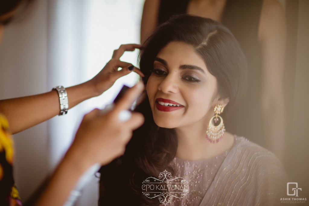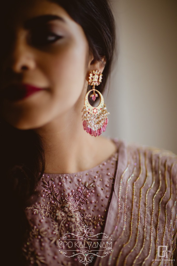 All you need to remember when choosing any accessory is that it should work with what you’re wearing and not against it. If your outfit has an embellished bodice like our belle’s, skip the necklace altogether and instead pair it with statement earring. Remember balance is key and not all outfits need a necklace. Reethu’s stunning choice of statement chandbhali earrings set in tournamaline stones are courtesy of MOD, Kochi who never fail to impress.