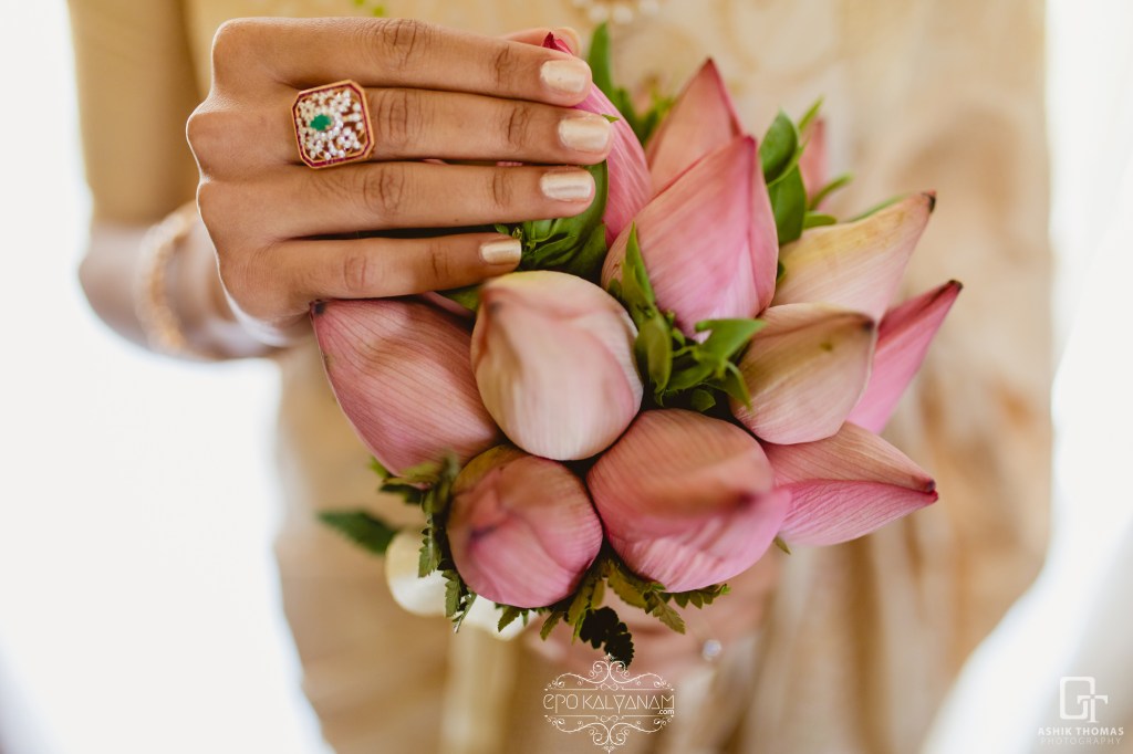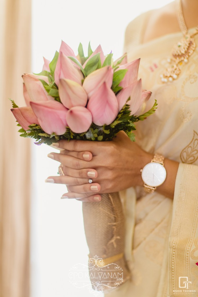 When it comes to weddings, flowers can be found everywhere. From bouquets to boutonnieres to floral decorations. They’re everywhere. Your wedding bouquet is like the cherry on top of your bridal look cake. The chosen blooms are a great way to express your personal style and taste and that is entirely what you see in these beautiful pink lotus buds paired with green fern leaves done to perfection by Roshni from The Hue Story.