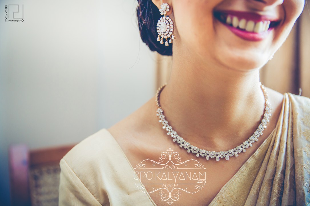 Her stunning hair and makeup was done once again by Jolly Hollywood Saloon, Kottayam. Often there are little details that may seem simple enough to take care of yourself in order to save on your budget, which may be true. But there’s one thing you definitely shouldn’t skimp on and that’s a wedding hair and makeup artist 💡. Now a beautiful piece of jewellery is the finishing touch to an outfit and what better than this stunning one layered diamond necklace and earrings from Kirthilal, Kochi.