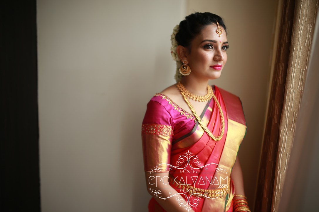 For their temple wedding, we have both our stunners looking like a dream. Riddhi, chose to shine in a gorgeous pink kancheepuram sari with golden zari work and green worked border on the edges. The highlight of this look truly comes from how minimalistically she’s chosen to go with her accessories.