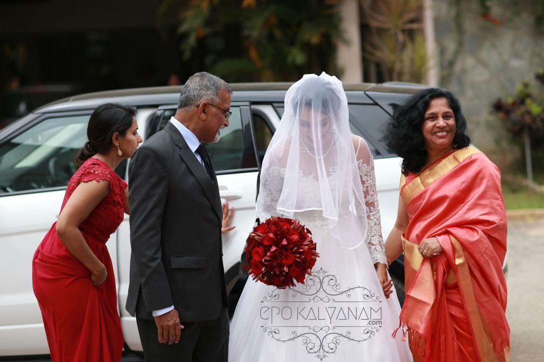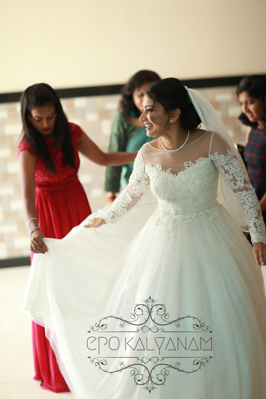For their Christian wedding, our bride was a vision in white. And may I also say, a very smart thinking vision too 😊. Riddhi had mentioned to me how she chose and wanted to have a simple but elegant wedding. She chose to wear a beautiful elegant sheer illusion A-line tulle skirt wedding gown designed and done by her friend Shruthi Savanth. The barely there illusion neckline makes it look as if the stunning embroidery is part of your skin. This dress is ideal if you’re looking for a long sleeved wedding dress but still want to show an alluring flash of skin.